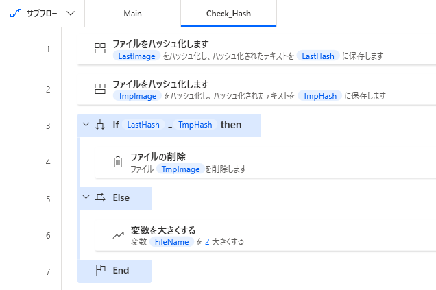 下記を新規に作成したサブフローに保存して名前を「Check_Hash」にします。